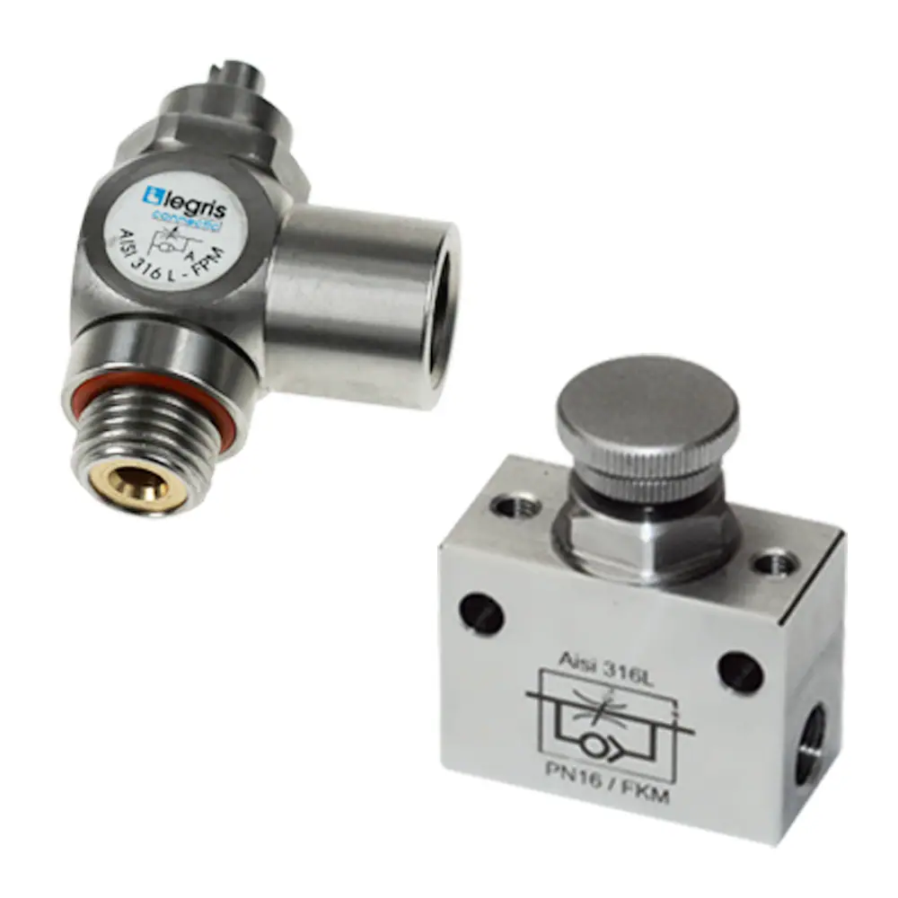 This range of metal quick exhaust valves is offered in nickel-plated brass, aluminium and stainless steel.These valves, suitable for any environment, increase the return speed of the cylinder rod by allowing the exhaust to pass directly to atmosphere.