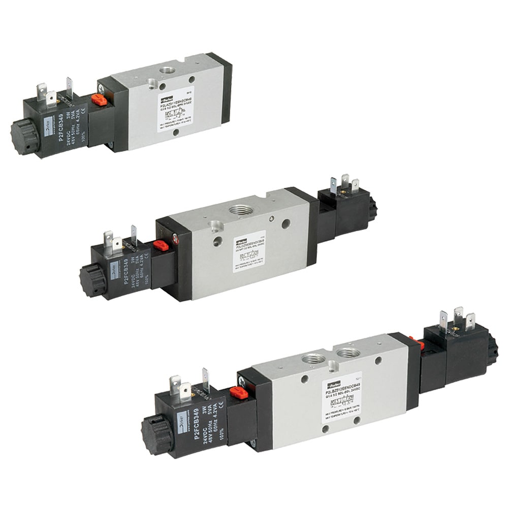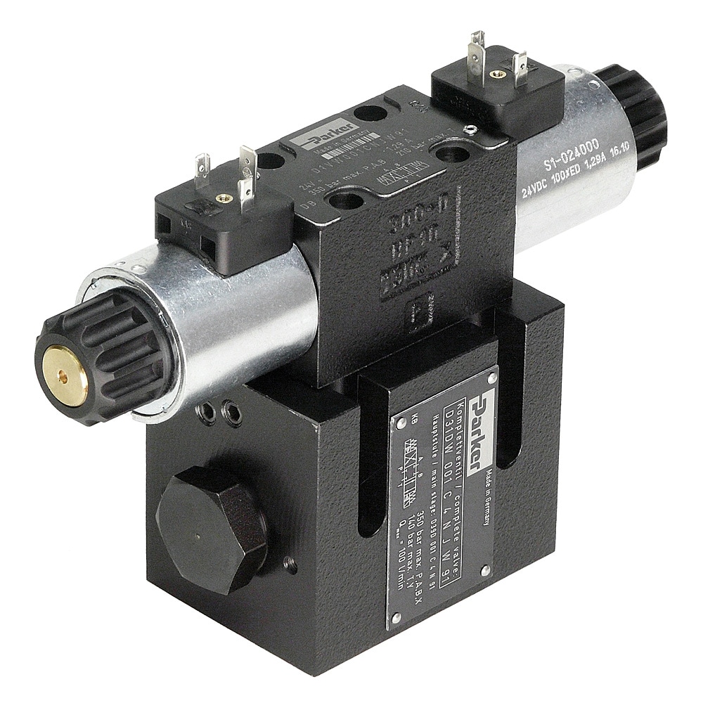 Parker has a large selection of direct acting 4-way, 3-position spool-type solenoid valves to cover a wide range of flow requirements up to 57 lpm (15 gpm) and pressures as high as 350 bar (5000 psi); closed, open, float, and tandem centers available.