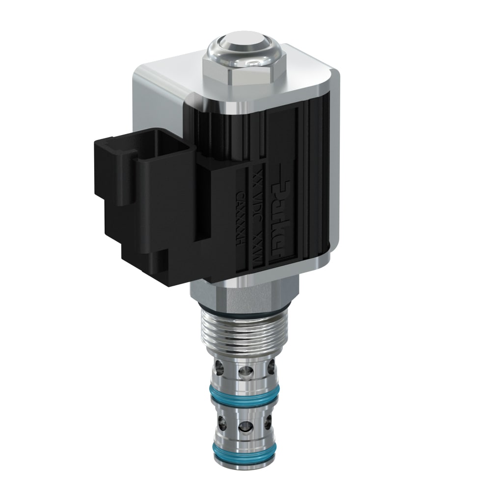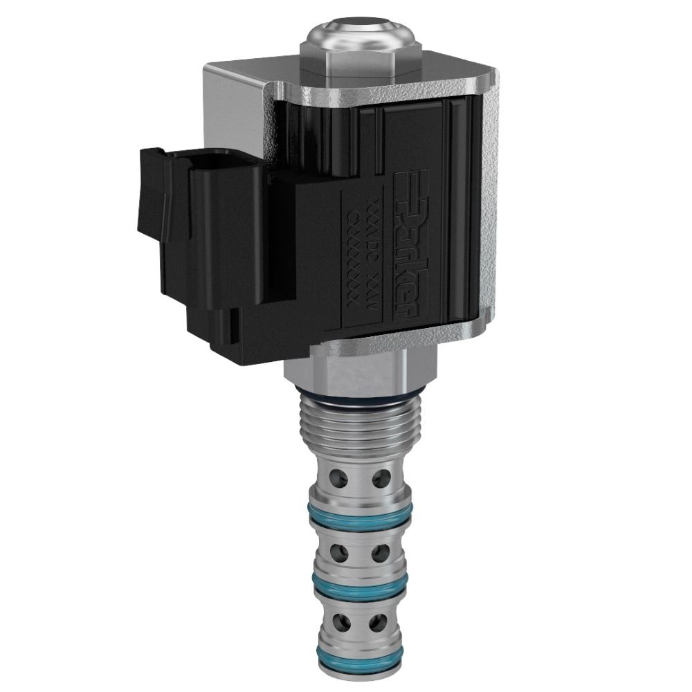 Parker's 2-way poppet solenoid valves check flow in one direction with very low leakage and free flow opposite; normally-open or normally-closed configurations available. Capable of pressures up to 350 bar (5000 psi) and flows up to 260 lpm (70 gpm).