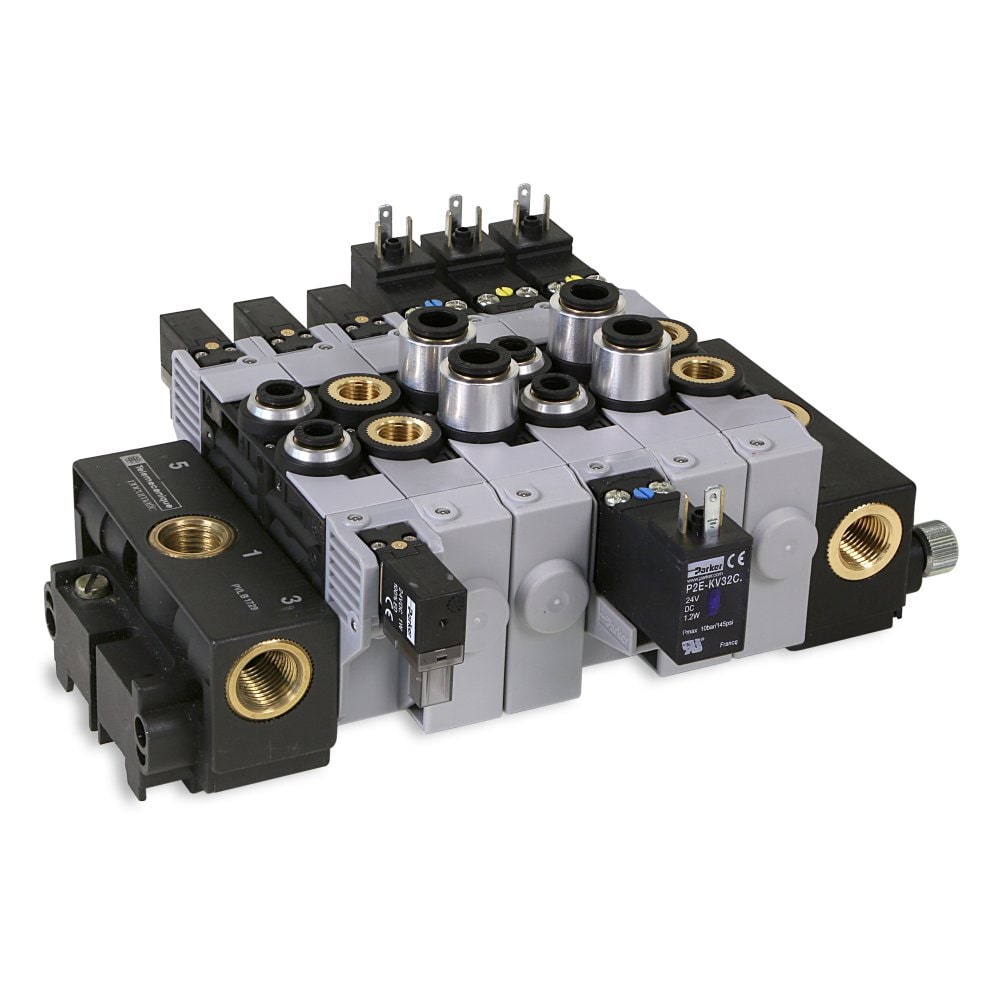 The Moduflex series is an air piloted stacking valve. Functions are 4/2, 3/2, and dual 3/2. S series, T series, and V series wiring configurations. V series collective wiring- 20 and 25 pin Dsub, IO-Link and Industrial Ethernet protocols.