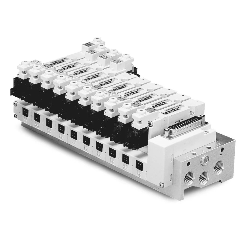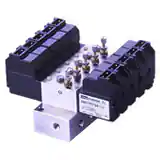The Moduflex series is an air piloted stacking valve. Functions are 4/2, 3/2, and dual 3/2. S series, T series, and V series wiring configurations. V series collective wiring- 20 and 25 pin Dsub, IO-Link and Industrial Ethernet protocols.