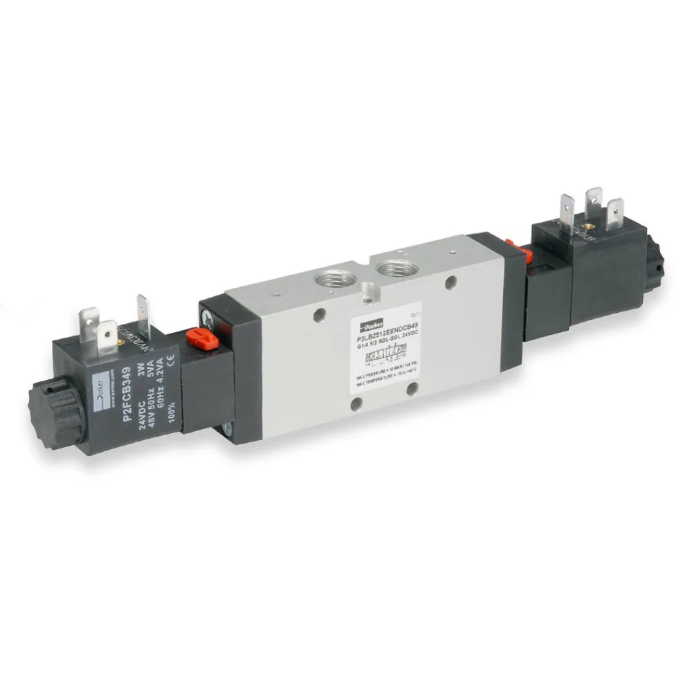 Parkers' 5-Way Dual Solenoids G 1/2" Solenoid Valves provide operating pressures up to 10 bar and flow factors up to 45 l/min. They offer multiple body and sealing materials for all general purpose fluid control applications.