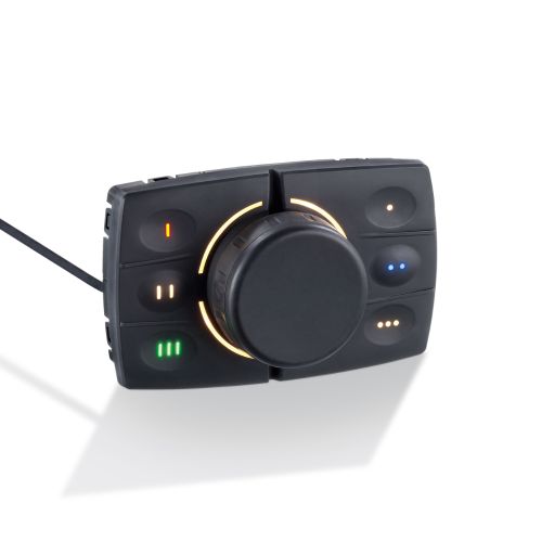 The ecomatPanel has been designed for use in the harsh environment in driver’s cabins. The function keys and the rotary button with integrated 4-way button and push function ensure easy handling even when wearing gloves. The illuminated ring around the rotary button, consisting of four segments, as well as the illuminated keys provide a clear overview of the set functions. All LED lighting elements can be set separately and assigned individual colours.