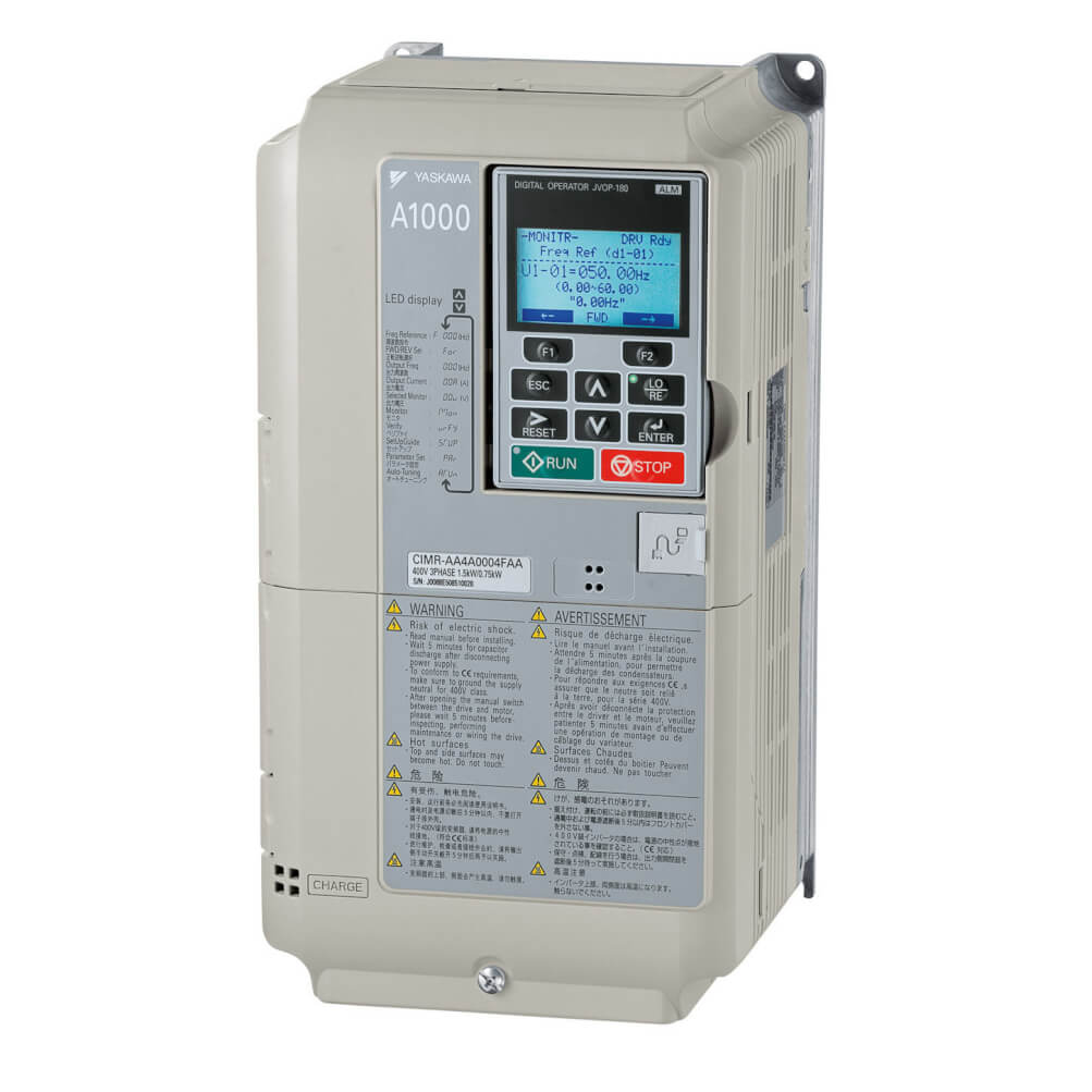 A1000 inverter: 3-phase 200 V, HD: 75 kW 283 A, ND: 90 kW 312 A, max. output freq. 400Hz
